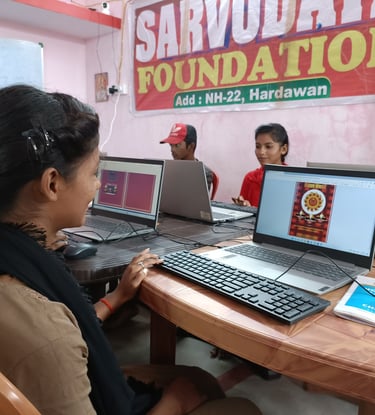 We have successfully trained over 250 young individuals in computer skills. Many of them have embarked on entrepreneurial journeys, establishing businesses such as cyber cafes where they assist others in online form filling for exams, Aadhar card applications and modifications, and ration card downloads. Additionally, some of our students have found employment opportunities at nearby printing shops and graphic design studios. A few have even collaborated with local YouTubers to create captivating graphics for their video content.